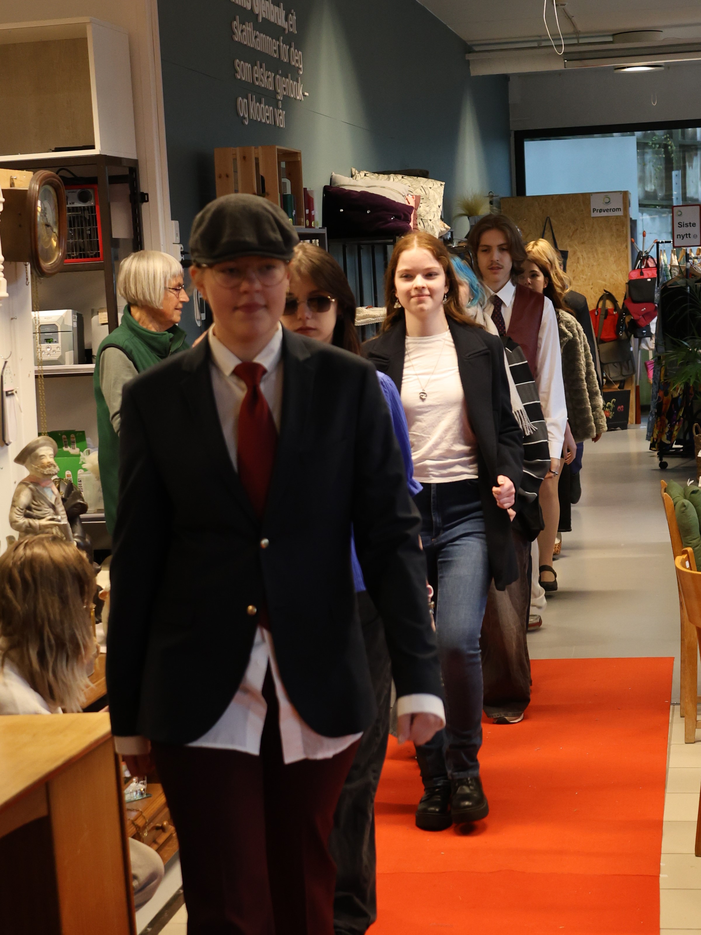 Feiringa i butikken var godt førebudd. Ekstra forventning var det til samarbeid og bidrag frå elevar ved Borgund VGS som på førehand fekk plukke seg ut klede til redesign og mannekengoppvisning. Dette vart teke på alvor og vart ein hending på raud løpar med tilhøyrande musikk og applaus. Veret var ikkje etter ynskje, men svært mange fann vegen til både feiring, kaffi, kake og handel.Vi er mange som er takksame for dei som gjekk føre og for det vi er med på i NMS Gjenbruk.